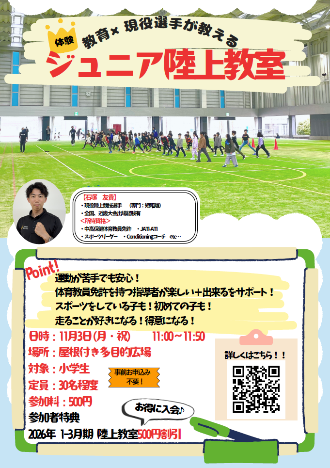 2026年1-3月期のジュニア陸上教室の入会料500円引き券をお渡しします!!